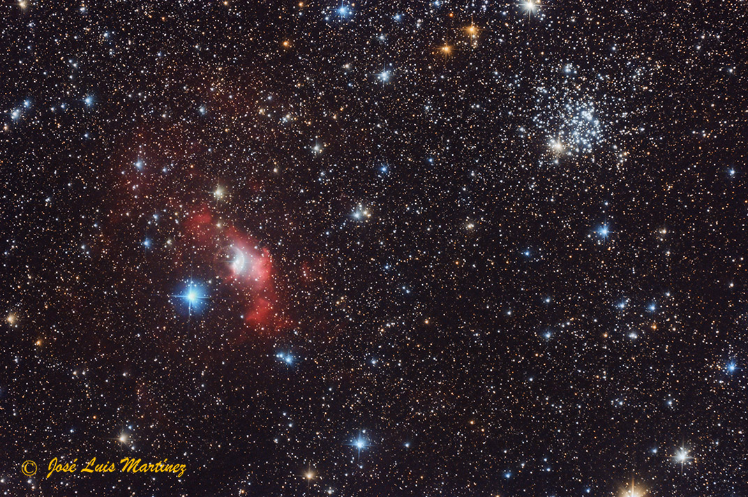 En la siguiente fotografía, hecha desde Querol el 18 de noviembre de 2017 con un telescopio reflector Skywatcher 200/1000 y una cámara Canon EOS 550D, pueden verse la nebulosa, hacia el centro y a la izquierda y el cúmulo, arriba y a la derecha.