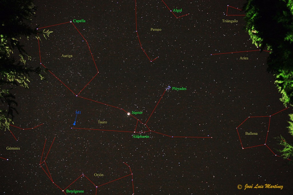 En la fotografía siguiente, hecha desde Siurana, en el Alt Empordà (Gerona) el 6 de diciembre de 2012 con una cámara Canon EOS 30D y un objetivo Sigma 17-70, puede verse la ubicación en el cielo de la nebulosa del Cangrejo (coordenadas ⇒ AR: 5h 34m 32s / Dec: +22º 00′ 52″). También puede verse Júpiter, que aquellos días estaba en la constelación de Tauro.