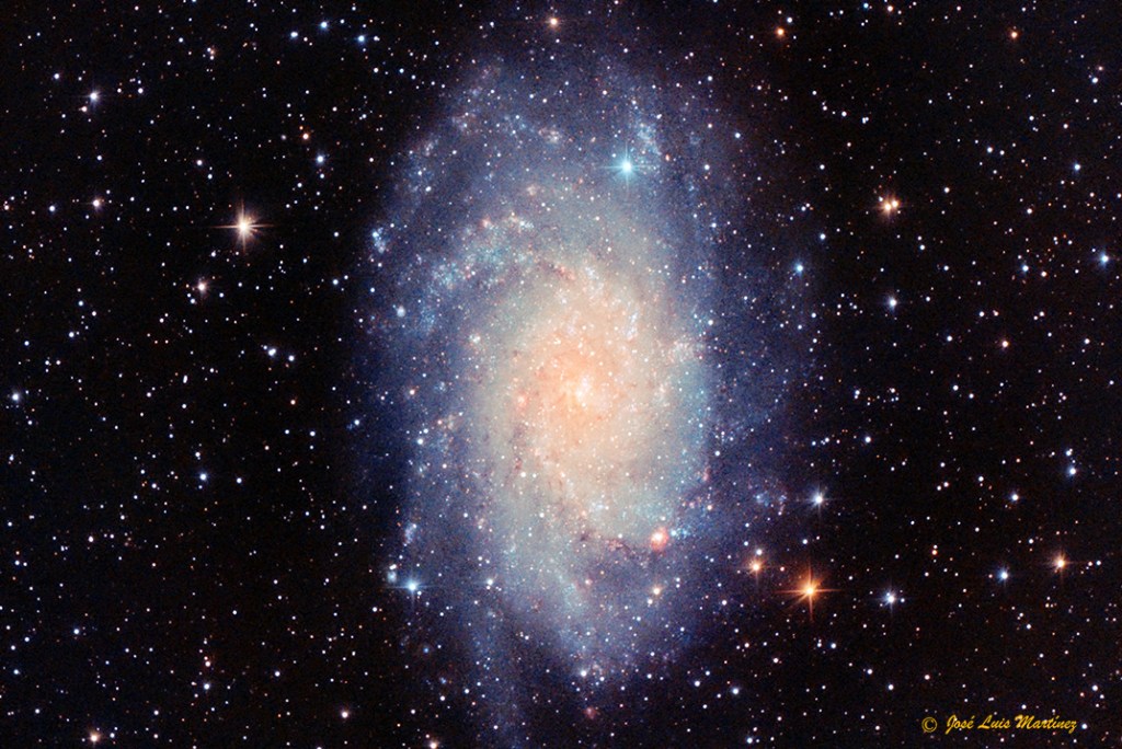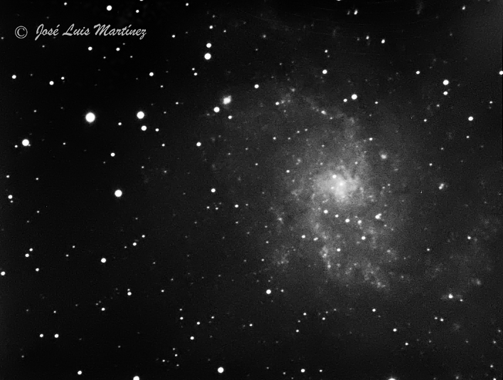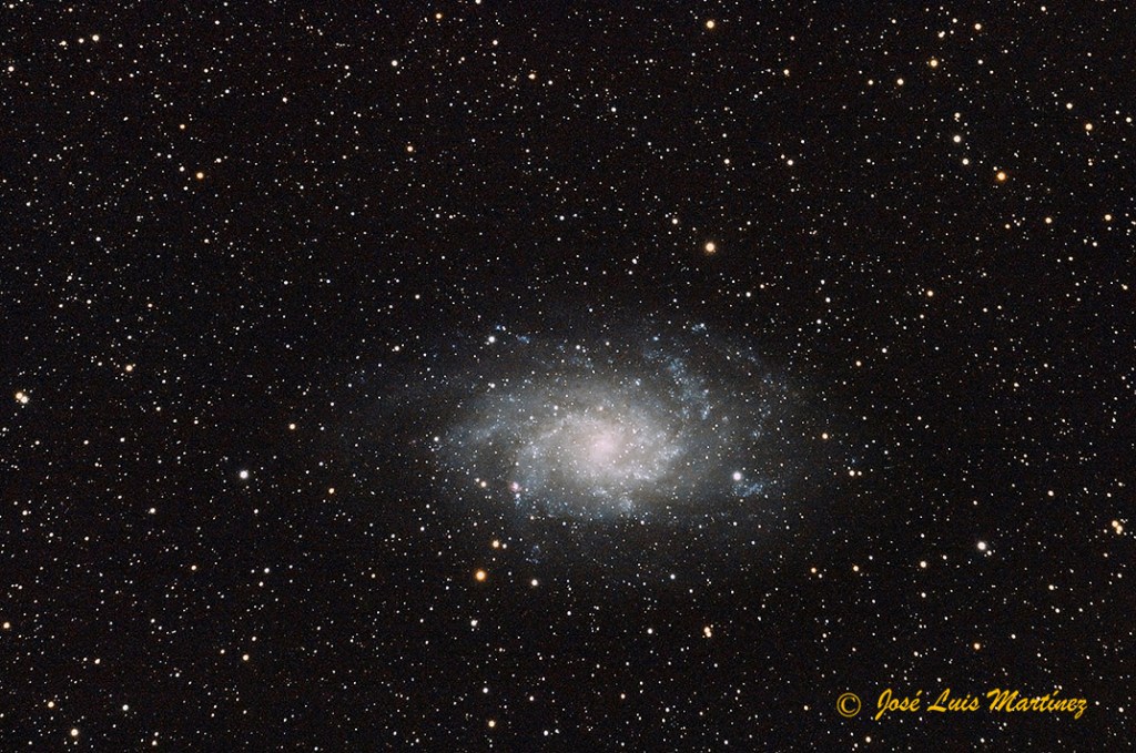 La imagen siguiente es también de la galaxia del Triángulo. No es tan espectacular como las anteriores, pero es que también la hice desde el cielo urbano de Cornellà de Llobregat, con un índice Bortle de 8,6 (el índice Bortle es una escala que mide el brillo del cielo nocturno; va desde 1, para un cielo totalmente oscuro, hasta 9, cielo típico del centro de una ciudad con una alta contaminación lumínica). Esta foto es del día 28 de noviembre de 2013 y la hice con un telescopio refractor Long Perng ED80 y una cámara Meade DSI II Pro.