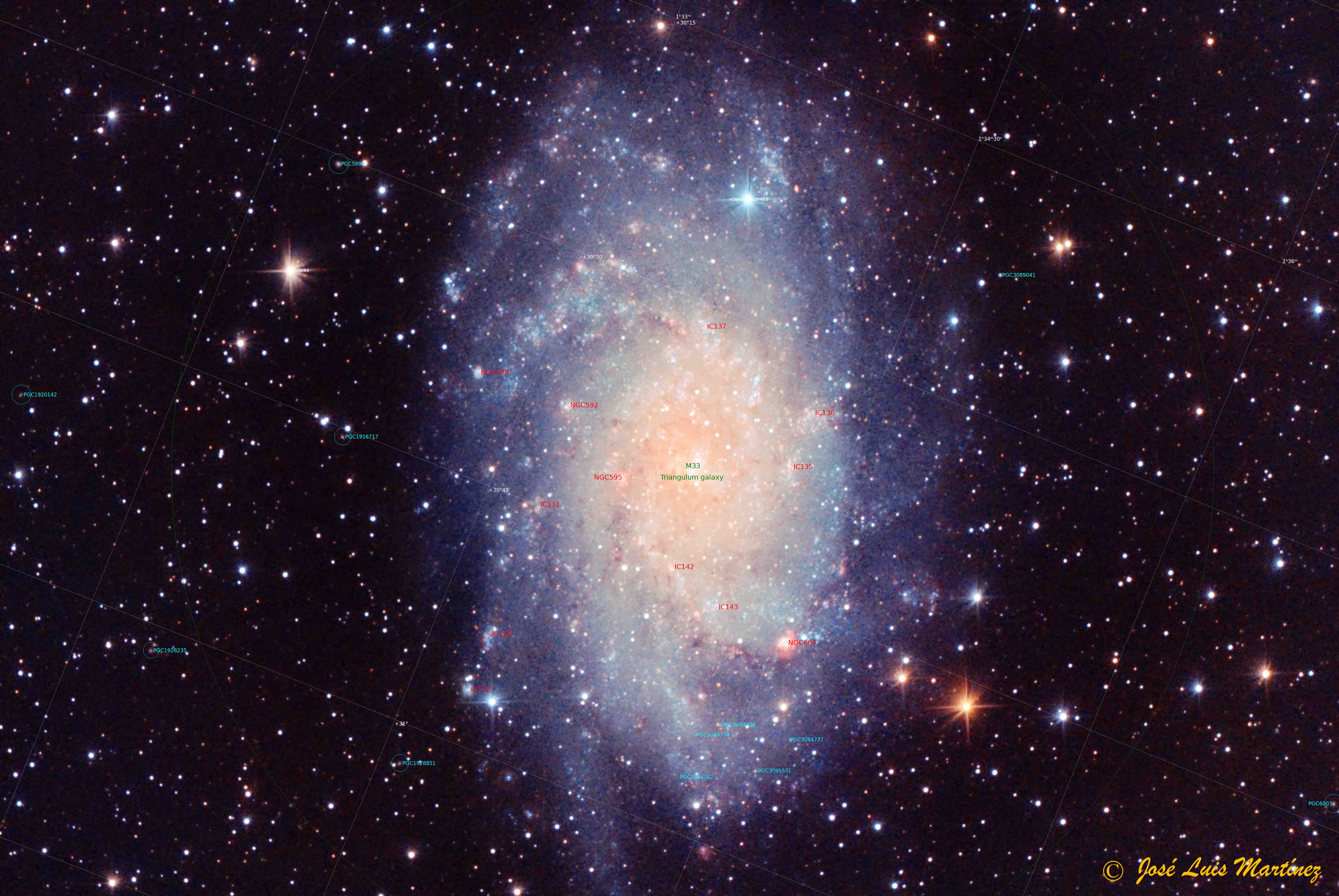 Pero, como he comentado, hay unas cuantas más nebulosas de emisión en sus brazos espirales. La siguiente imagen, que es la misma que la que abre el artículo, son las anotaciones que da PixInsight tras pedirle una resolución de placas. También hay unas cuantas galaxias del catálogo PGC por el fondo, pero muy pequeñas porque están muy lejos.