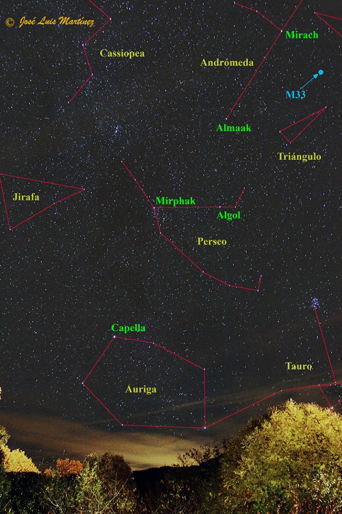 La imagen siguiente, hecha desde Cercs, en el Berguedà (Barcelona) el 2 de noviembre de 2013 con una cámara Canon EOS 30D y un objetivo Sigma 17-70, muestra la ubicación de la galaxia del Triángulo en el cielo (coordenadas ⇒ AR: 1h 33m 51s Dec: +30º 39′ 36″).