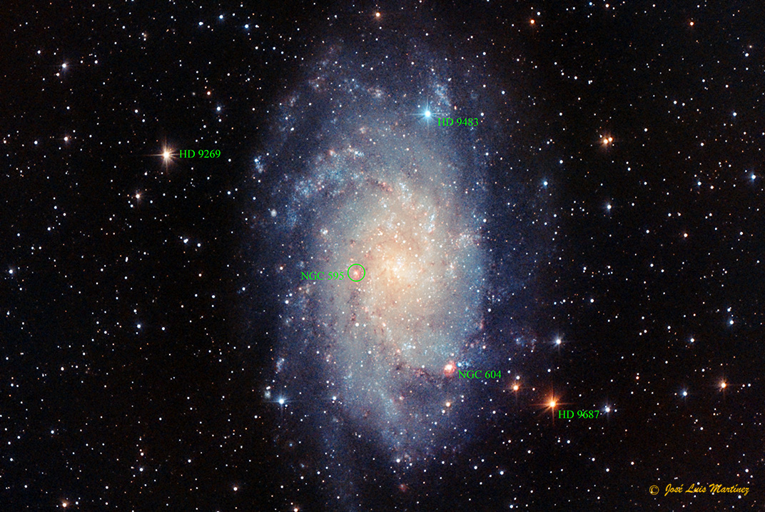 En la imagen siguiente, que es la misma que abre el artículo, he señalado las dos que destacan más, NGC 604 y NGC 595.