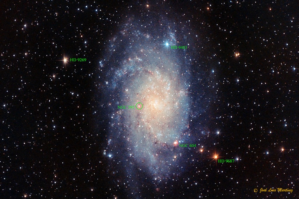 También he señalado las tres estrellas que más destacan, las tres de magnitud aparente 8. HD 9687 es una estrella naranja-roja de tipo espectral k, la cual está a una distancia de unos 1300 años luz de nosotros; HD 9483 es una estrella doble azul-blanca de tipo espectral A, situada a unos 700 años luz de distancia; HD 9269 es una estrella gigante naranja-roja de tipo espectral K, que está a unos 1400 años luz de distancia; estas tres estrellas, evidentemente son de la Vía Láctea.