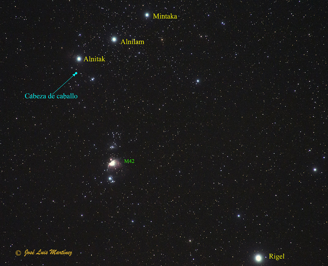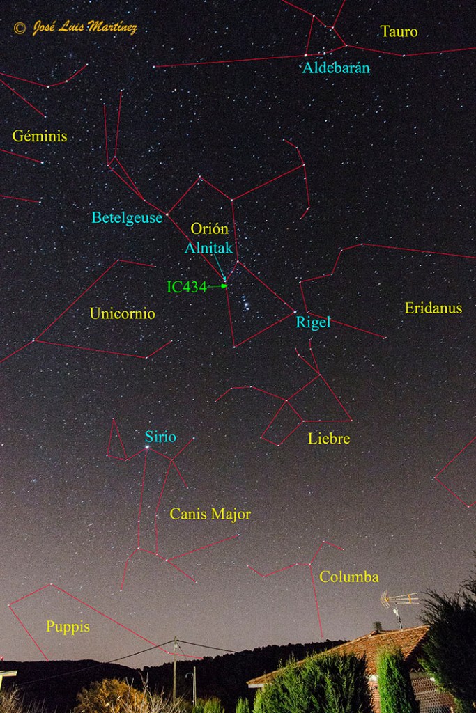 La siguiente fotografía, realizada desde Querol el día 16 de enero de 2016 con un telescopio refractor Long Perng ED80 y una cámara Canon EOS 70D, muestra, además de las tres nebulosas mencionadas, la nebulosa de la Flama (NGC 2024), justo «tocando» a Alnitak, la estrella tan brillante que está a la derecha de la nebulosa de la Flama. También se ve la estrella σ Ori, la responsable de que IC 434 brille. En la fotografía, es la estrella brillante que aparece por el centro y un poco a la derecha de la imagen.