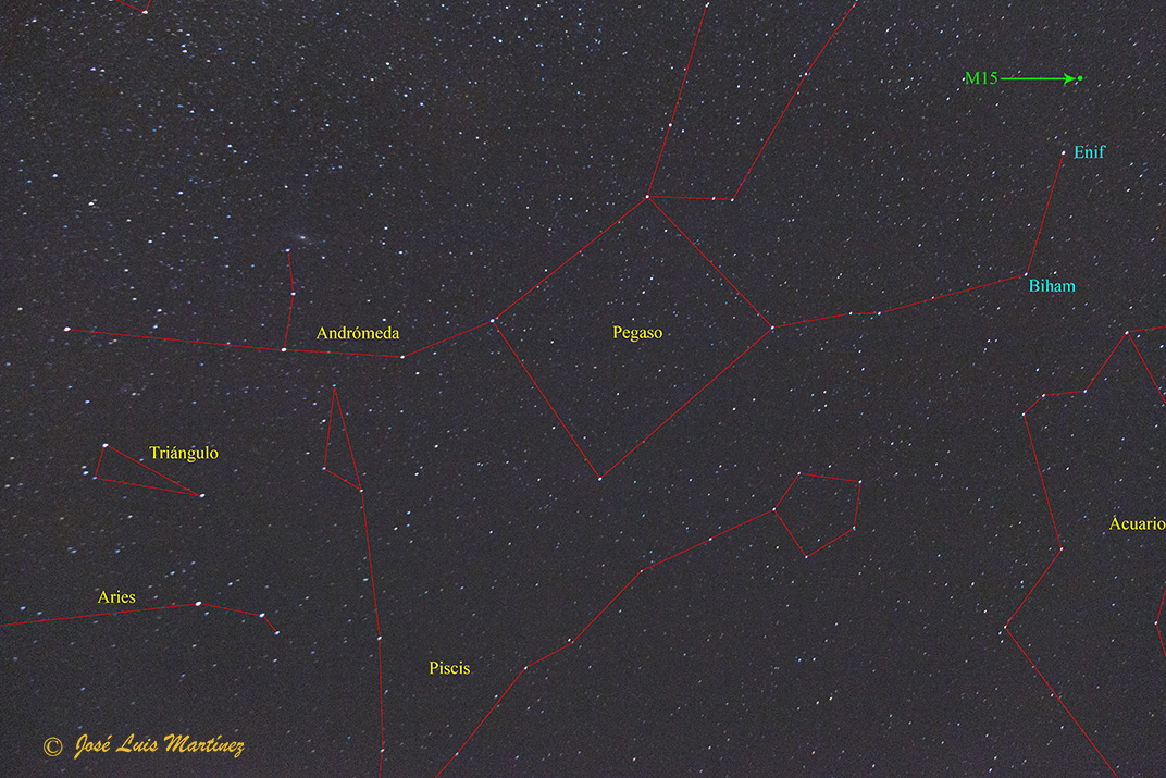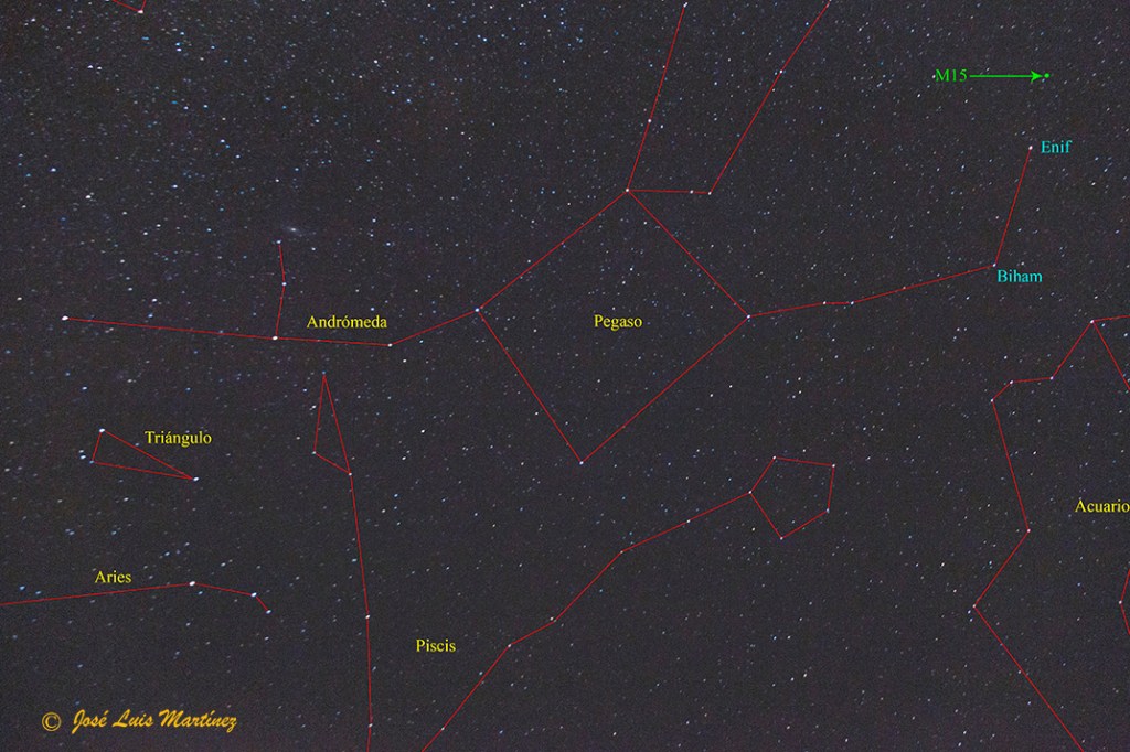 En la imagen inferior, hecha desde Querol el día 8 de septiembre de 2018 con una cámara Canon EOS 70D y un objetivo Canon 15-85, se muestra la ubicación de M15 en el cielo (coordenadas ⇒ AR: 21h 29m 58s / Dec: +12º 10′ 01″).