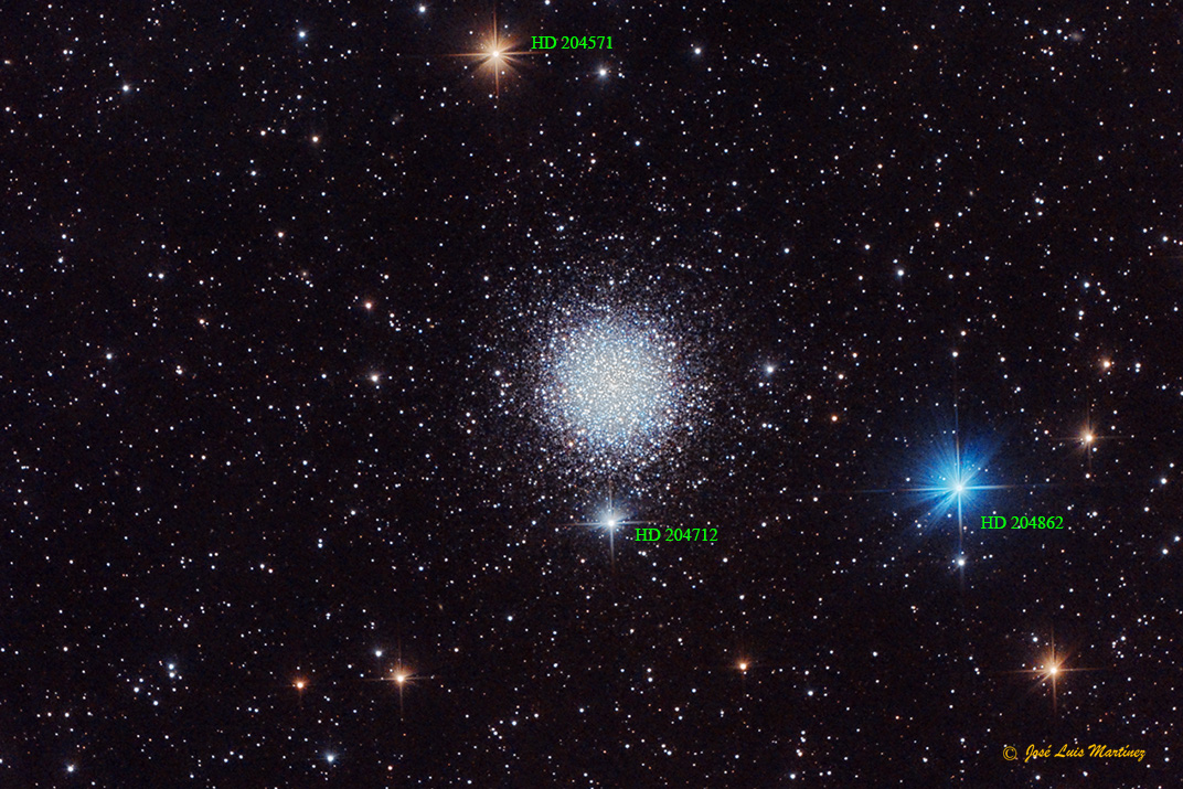 M15 se puede identificar fácilmente, con instrumentos ópticos, porque está enmarcado dentro de un «triángulo rectángulo» cuyos vértices son las tres estrellas más brillantes del «entorno», HD 204571, HD 204712 y HD 204862, las cuales he señalado en la imagen siguiente, que es un recorte de la que abre el artículo.