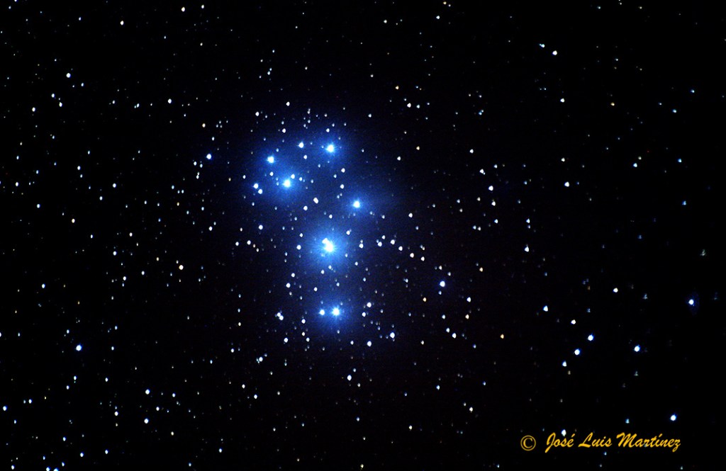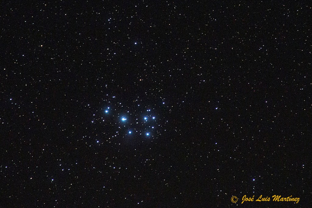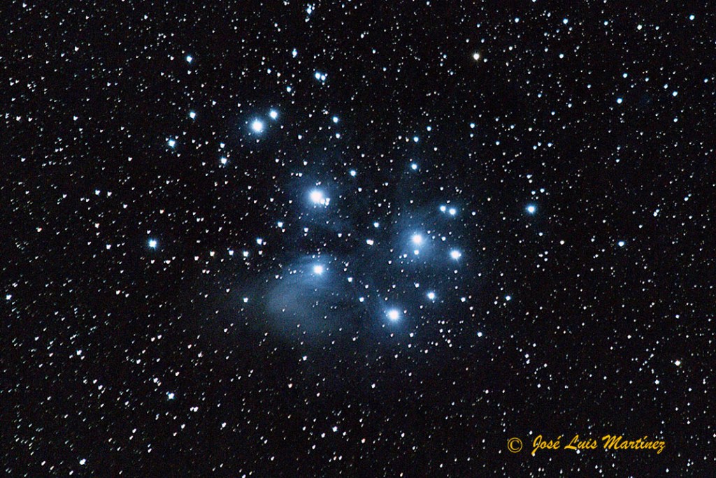 Según la mitología griega, las Pléyades eran siete hermanas (Alcyone, Electra, Maia, Merope, Taigeta, Celaeno y Asterope), hijas del Titán Atlas y la ninfa marina Pleione, por eso el nombre de estas estrellas más brillantes y visibles a simple vista, de este cúmulo abierto. En El cinturón y la espada de Orión, comento algo más sobre la mitología de las Pléyades.