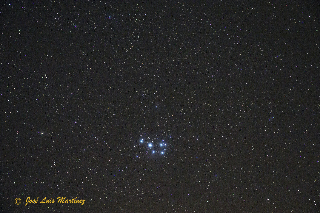 La imagen de abajo, hecha desde Cercs, en el Berguedà (Barcelona) el 2 de noviembre de 2013 con una cámara Canon EOS 30D y un objetivo Sigma 17-70, muestra la ubicación de las Pléyades en el cielo (coordenadas ⇒ AR: 3h 47m / Dec: +24º07′).