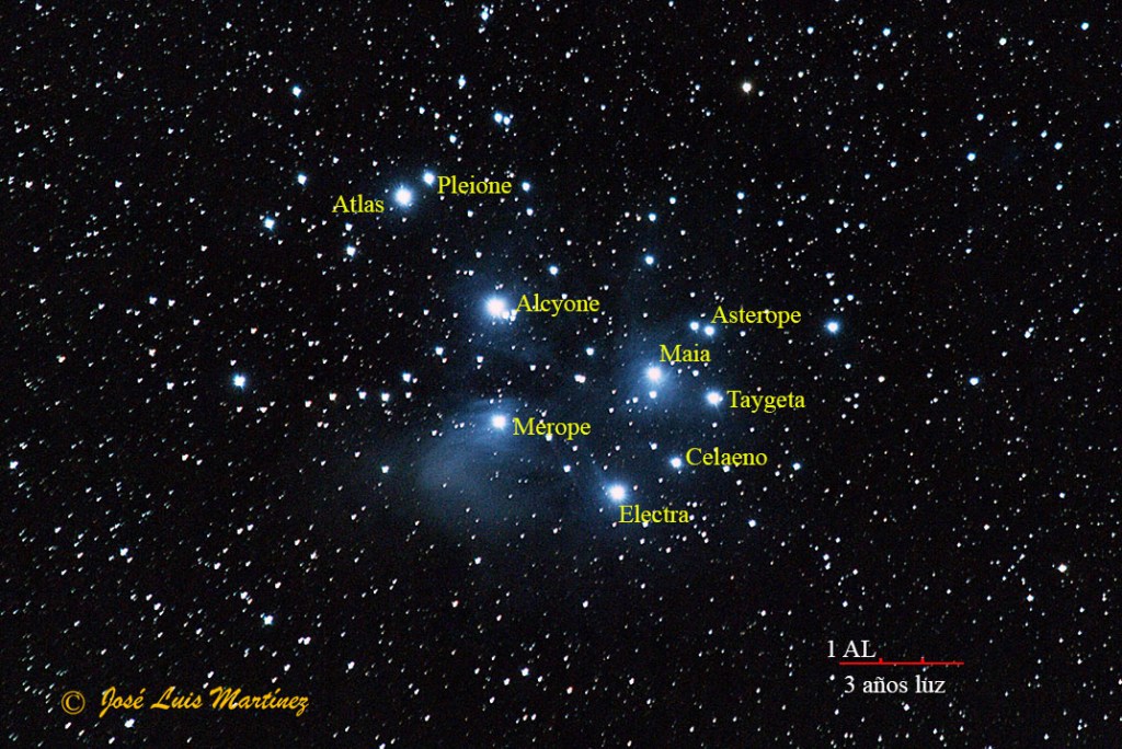 La fotografía anterior, realizada desde Querol el 9 de enero de 2016 sin telescopio, con una cámara Canon EOS 70D y un objetivo Canon 15-85, es del cúmulo abierto de las Pléyades (M45); en ella están marcadas las estrellas más importantes de dicho cúmulo y una escala en años luz. La distancia entre sus dos estrellas más brillantes, Atlas y Alcyone, es de unos 3 años luz, mientras que entre Electra y Celaeno o entre Maia y Asterope hay poco más de un año luz.