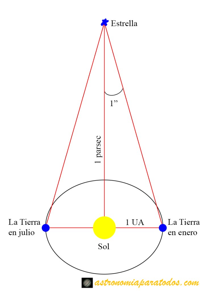 Si observamos una estrella desde la Tierra desde dos lados opuestos de su órbita, es decir, con una diferencia de seis meses (por ejemplo en invierno y en verano), podemos considerar el triángulo formado por las dos líneas que unen la estrella con las dos posiciones de la Tierra y la línea que une estas dos posiciones opuestas de la Tierra, cuya longitud será de 2 UA. Consideremos el ángulo formado por la estrella y las dos posiciones de la Tierra.