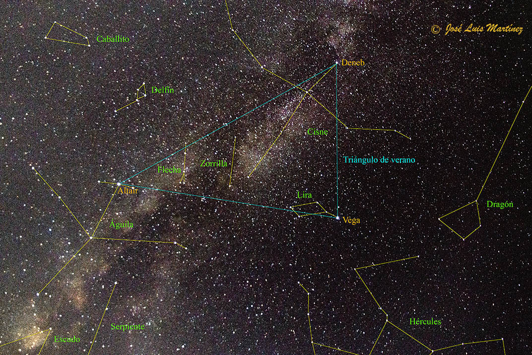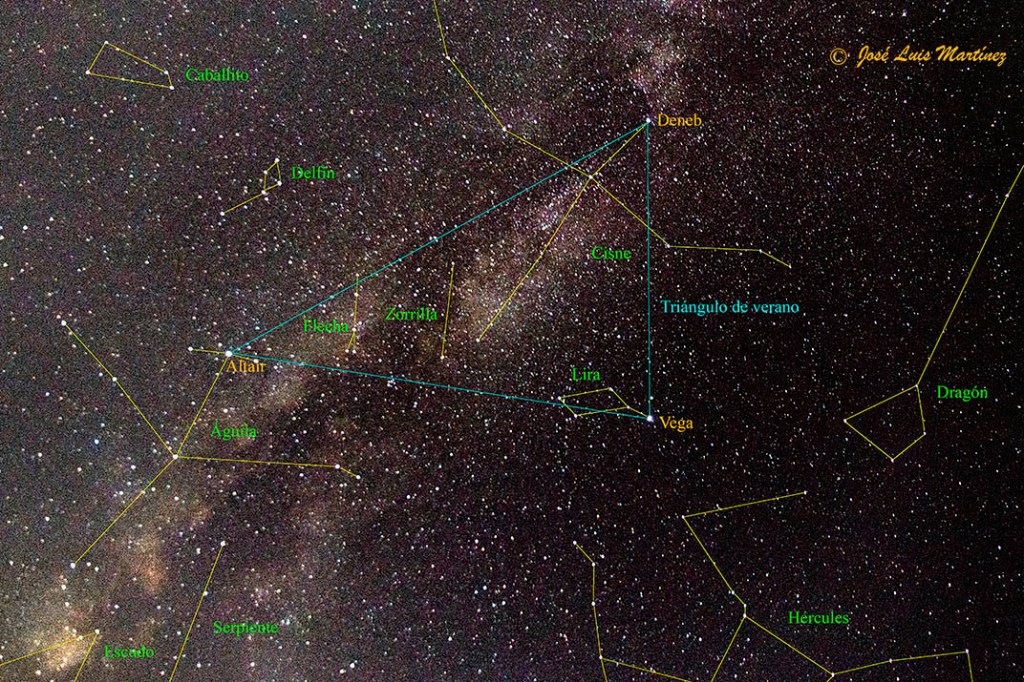 De esta manera tenemos asterismos en los que sus estrellas pertenecen a diferentes constelaciones, como el popular Triángulo de verano, formado por las estrellas Deneb del Cisne, Altair del Águila y Vega de la Lira, tal como muestra la fotografía, realizada desde Querol el 6 de julio de 2017 con una cámara Canon EOS 70D y un objetivo Canon 15-85.
