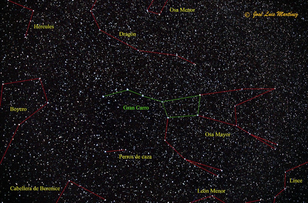 Pero también hay asterismos en que sus estrellas son de la misma constelación, como el más famoso de todos, el Gran Carro de la Osa Mayor, formado por las siete estrellas de la cola de esta constelación y que delimitan una figura que nos recuerda un carro (o un cucharón para los ingleses). Este asterismo de la Osa Mayor puede apreciarse en la siguiente fotografía, hecha desde Sant Llorenç de la Muga, en el Alt Empordà (Gerona) el 3 de mayo de 2014 con una cámara Canon EOS 70D y un objetivo Canon 15-85.