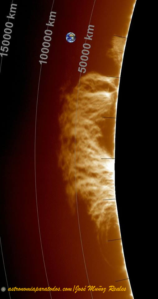 También hay una escala en kilómetros y una Tierra en la zona de la protuberancia mayor, para hacerse una idea del tamaño de estos fenómenos de actividad solar, ya que nos permite ver la comparativa entre el tamaño de la Tierra y estas actividades solares.
