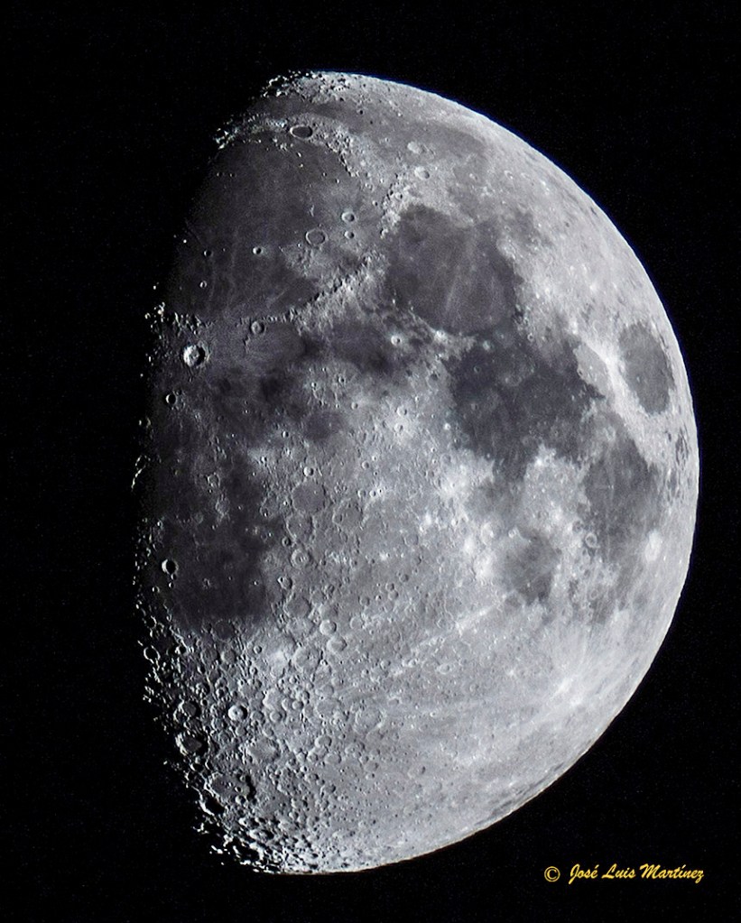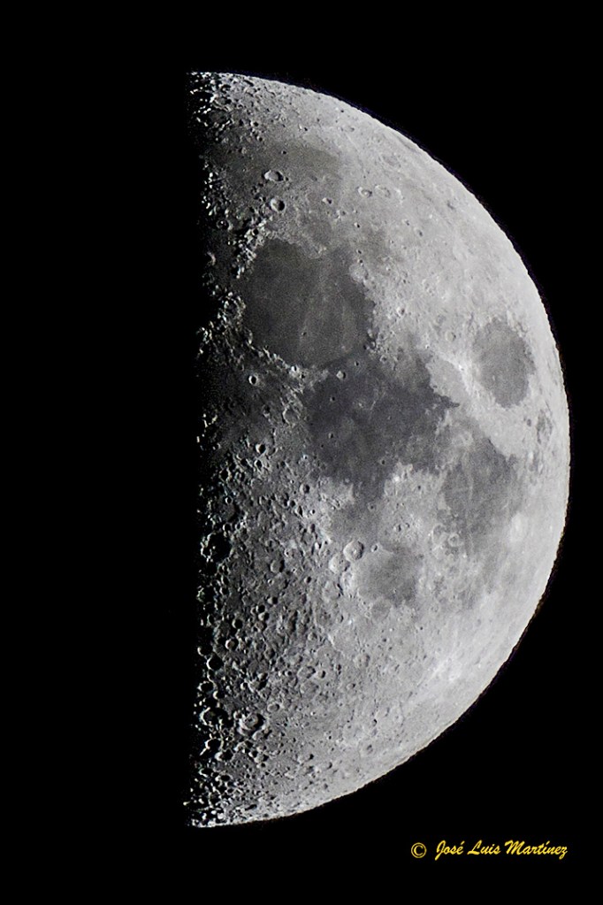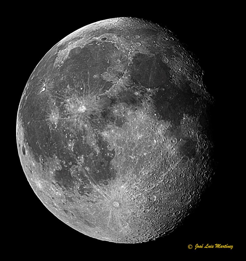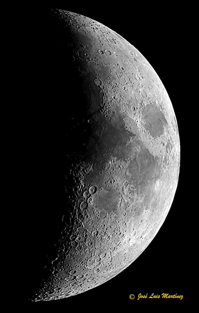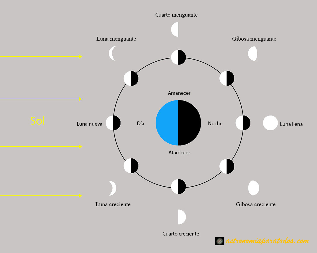 El ciclo comienza en la Luna nueva, momento en el que la Luna está en conjunción con el Sol y presenta a la Tierra el hemisferio no iluminado por el Sol. Día tras día, empezamos a ver la Luna un poco más iluminada (decimos que está en Luna creciente) hasta que, a la semana, la Luna está a 90º del Sol y nos presenta un semicírculo iluminado; está en Cuarto creciente. A partir de aquí hasta la Luna llena, decimos que la Luna está en fase Gibosa creciente. Las imágenes siguientes nos muestran la Luna en tres fases de la etapa creciente. La primera es un mosaico de cinco fotografías realizadas con un telescopio reflector Celestron 150/750 y una cámara Philips SPC900; la segunda es una única toma realizada con un telescopio refractor Long Perng ED80 y una cámara Canon EOS 70D y la tercera es también una toma realizada con la EOS 70D y un objetivo Canon 70-300.