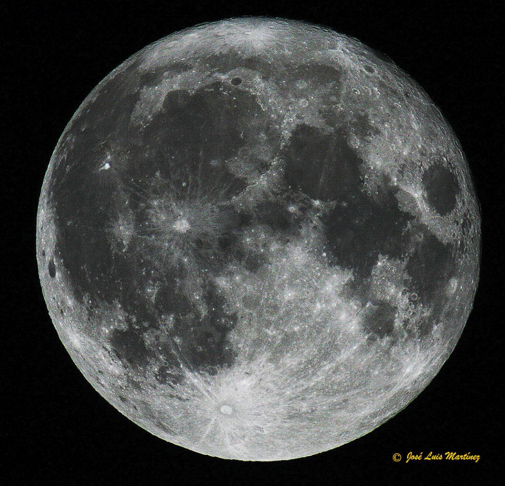 Dos semanas después de la Luna Nueva, la Luna está en oposición (la Tierra está entre el Sol y la Luna) y desde la Tierra vemos toda la cara de la Luna iluminada; está en Luna llena. La imagen de la izquierda, realizada con un telescopio refractor Long Perng ED80 y una cámara Canon EOS 30D, corresponde a esta fase del ciclo lunar.