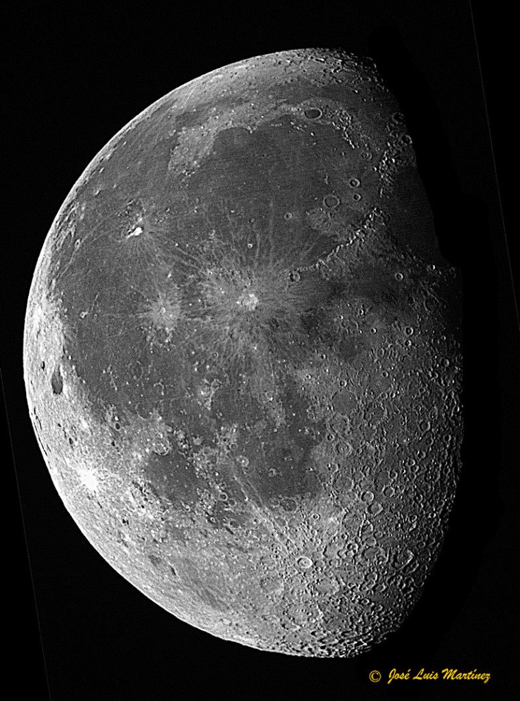 A partir de aquí, la zona iluminada de la Luna empieza a disminuir (decimos que está en Gibosa menguante) hasta que, a la semana de la Luna Llena, la Luna vuelve a estar en cuadratura con el Sol y nos presenta un semicírculo iluminado, pero el opuesto al de dos semanas antes; está en Cuarto menguante. Después, la zona iluminada sigue disminuyendo (está en fase de Luna menguante) hasta que, finalmente, y pasadas dos semanas de la Luna Llena, la Luna vuelve a estar en conjunción con el Sol, llegando de nuevo a la Luna Nueva. Las imágenes siguientes nos muestran la Luna en dos fases de la etapa menguante. La primera es un mosaico de siete imágenes realizadas con un telescopio reflector Celestron 150/750 y una cámara Philips SPC900 y la segunda es una única toma realizada con un telescopio refractor Long Perng ED80 y una cámara Canon EOS 30D.