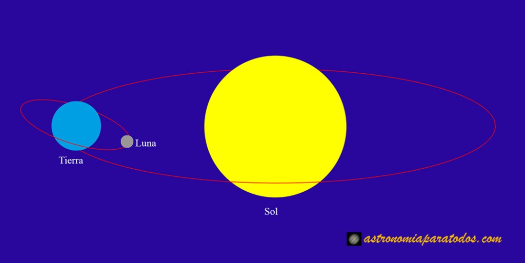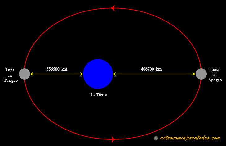 La Luna gira alrededor de la Tierra en sentido antihorario y siguiendo una órbita elíptica, con la Tierra en uno de sus focos. De esta manera, hay un momento en el que la distancia de la Luna a la Tierra es máxima (apogeo) y otro en que esta distancia es mínima (perigeo).