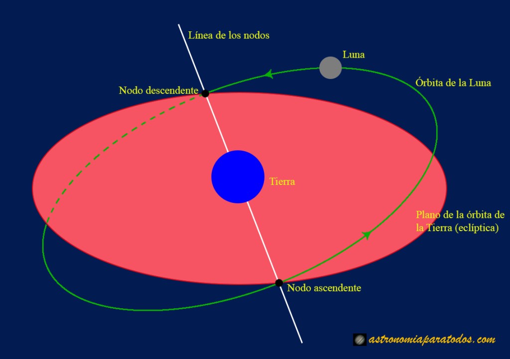 Esta inclinación hace que la Luna esté mayoritariamente o por encima o por debajo del plano de la eclíptica. Pero por este mismo motivo, habrá dos momentos que cruzará dicho plano, cuando pasa de estar por encima a estar por debajo y viceversa.