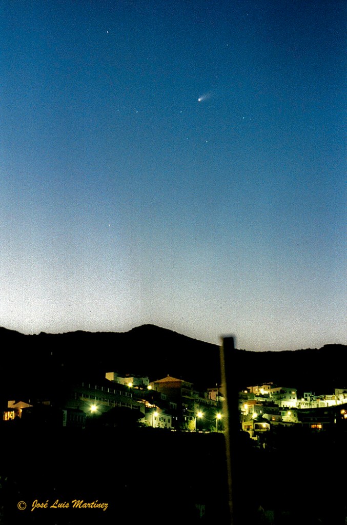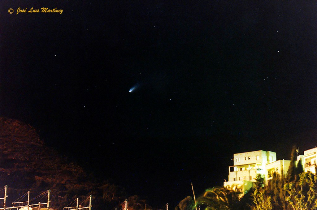 La fotografía de la izquierda está hecha desde Portbou, en el Alt Empordà (Gerona) el 29 de marzo de 1997, con una cámara Canon AE1 (analógica, en aquellos tiempos no existían las digitales, bueno sí, pero eran sus inicios y eran caras y malas) y un objetivo Canon FD 35-70. Por entonces ya era aficionado a la fotografía y a la astronomía, pero todavía no las había fusionado (no hacía astrofotografía), si bien no pude resistirme a hacerle fotos al Hale-Bopp y estas tres fotos del artículo son el resultado.