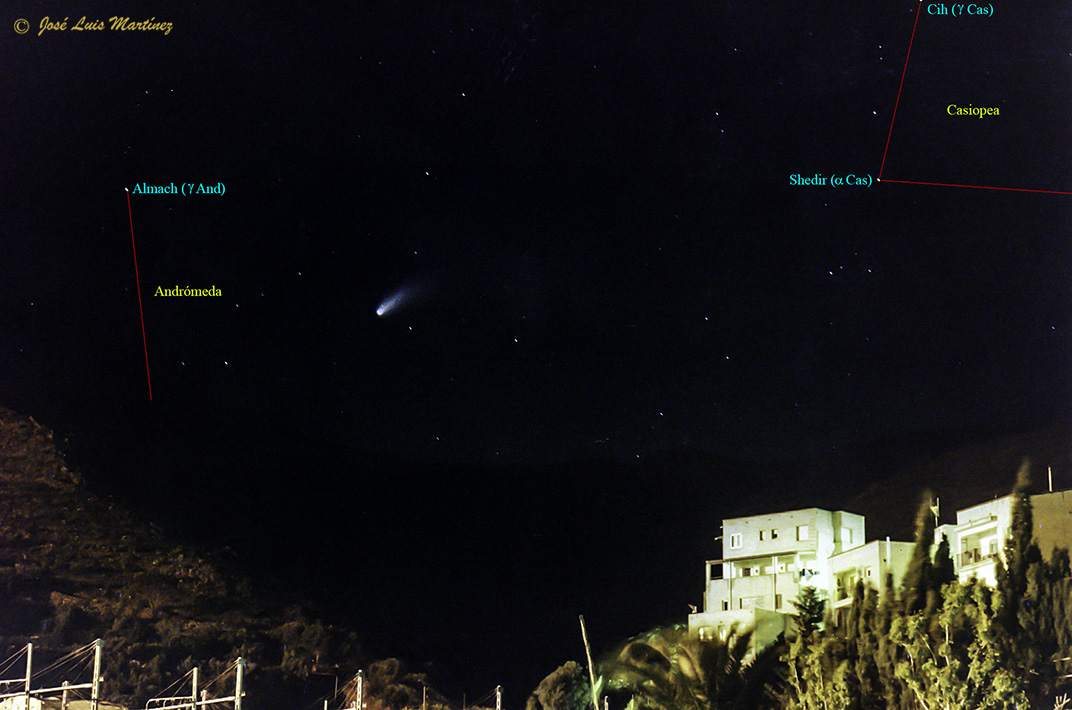 En la fotografía anterior, hecha también desde Portbou el mismo día con la misma cámara y objetivo, muestra el cometa pasando entre Andrómeda y Casiopea. La estrella más brillante a la izquierda de la foto es Almach (γ And), la tercera estrella más brillante de Andrómeda y la más brillante de la derecha de la foto es Shedir (α Cas), la estrella más brillante de Casiopea.