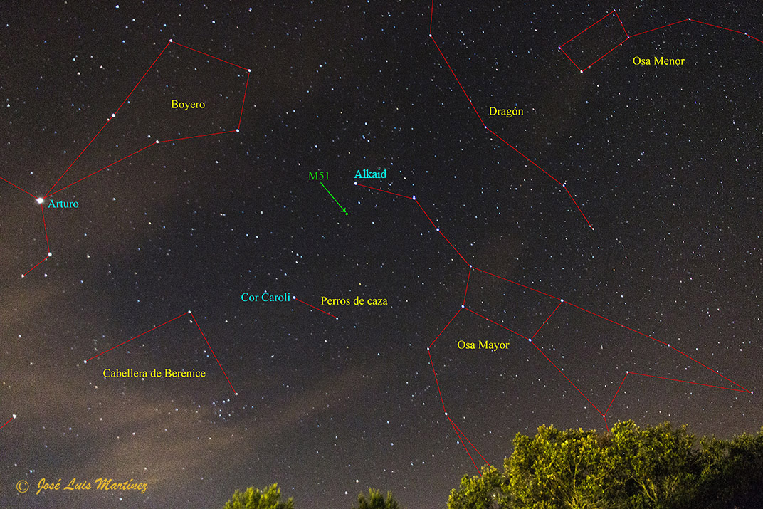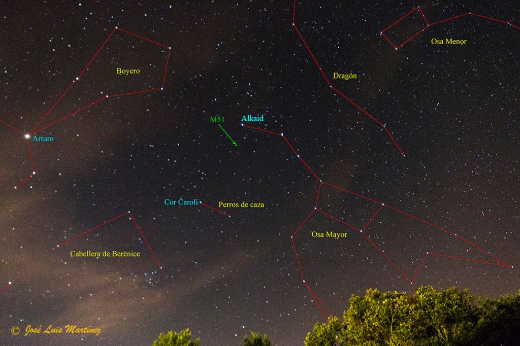 Como he comentado al inicio del artículo, M51 se encuentra en el cielo en la constelación de los Perros de caza (Canes Venatici). Si bien está dentro de los límites de dicha constelación, M51 está más cerca del asterismo de la Osa Mayor que no del de los Perros de caza. En concreto se encuentra a unos 3º de Alkaid (η UMa), la primera (o última) estrella de la Osa Mayor, como puede verse en la siguiente imagen, realizada desde Querol el 16 de junio de 2018 con una cámara Canon EOS 70D y un objetivo Canon 15-85 (coordenadas ⇒ AR: 13h 29m 53s / Dec. +47º 11′ 43″).