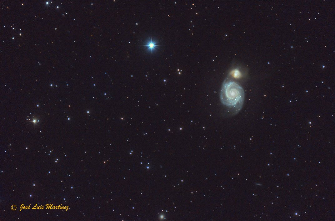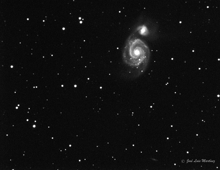 Las cuatro imágenes siguientes son también de M51, pero realizadas con un telescopio refractor Long Perng ED80 y una cámara Meade DSI II Pro. Las tres primeras las hice desde Pujalt, los días 01/04/2011, 01/06/2013 y 11/07/2015, respectivamente y la cuarta, está hecha desde el cielo urbano de Cornellà de Llobregat el día 27 de marzo de 2015. En la tercera fotografía puede apreciarse la galaxia IC 4263, abajo y un poco a la derecha de la imagen.