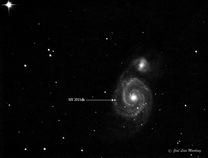En 2011, una estrella muy masiva de M51 acabó sus días explotando en una supernova, la cual fue denominada SN 2011dh. Brilló tanto que destacaba perfectamente en M51. Yo la estuve observando e incluso la fotografié; la siguiente fotografía la realicé desde el cielo urbano de Barcelona el día 8 de julio de 2011, con un telescopio reflector Celestron 150/750 y una cámara Meade DSI II Pro. En ella he señalado la supernova SN 2011dh.