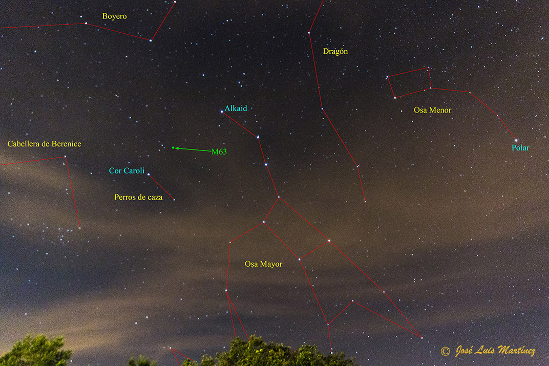 En la siguiente fotografía, realizada desde Querol el 16 de junio de 2018 con una cámara Canon EOS 70D y un objetivo Canon 15-85, está indicada la ubicación en el cielo de esta galaxia (coordenadas ⇒ AR: 13h 15m 49s / Dec: +42º 01′ 45″). Como puede observarse, está entre la estrella Cor Caroli de Canes Venatici y Alkaid de la Osa Mayor (como M51, pero en este caso más cerca de Cor Caroli).