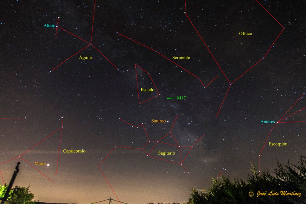 M17 está a unos 5000 años luz de distancia y se encuentra en el cielo en la constelación de Sagitario, aunque está más cerca del asterismo del Escudo que no del de Sagitario. La siguiente fotografía, realizada desde Querol el día 16 de junio de 2018 con una cámara Canon EOS 70D y un objetivo Canon 15-85, muestra la ubicación en el cielo de esta nebulosa (coordenadas ⇒ AR: 18h 20m 47s / Dec: -16º 10′ 19″).