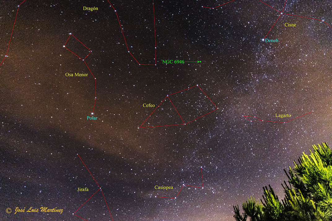 Entre las constelaciones de Cefeo, el Dragón y el Cisne, pero dentro de los límites de Cefeo, se encuentra un bello objeto de cielo profundo: la galaxia de los fuegos artificiales, catalogada como NGC 6946.