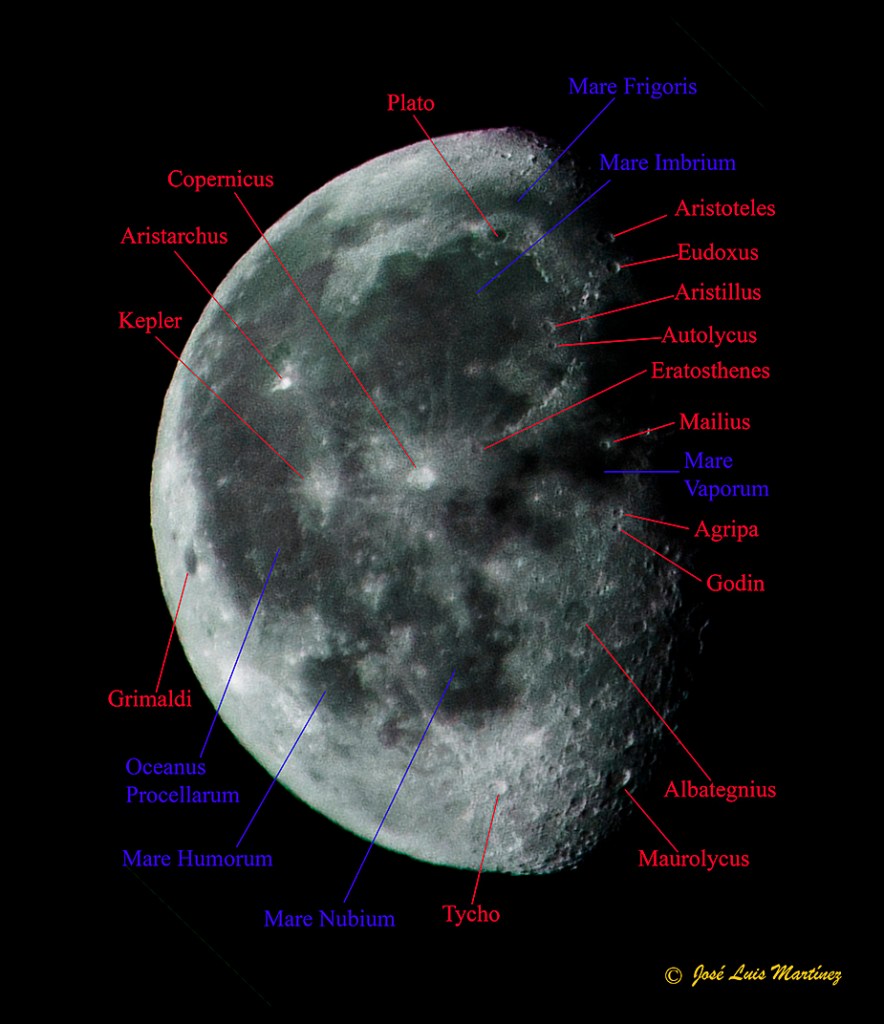 Aquí la Luna se encontraba en fase gibosa menguante en su 19º día, a tres días de cuarto menguante y con una iluminación del 81%. En esta fase su geología es mucho más apreciable, especialmente en la zona del terminador (frontera entre el día y la noche selenita), donde el contraste y las sombras son mucho más marcados. He señalado los cráteres y mares más importantes.