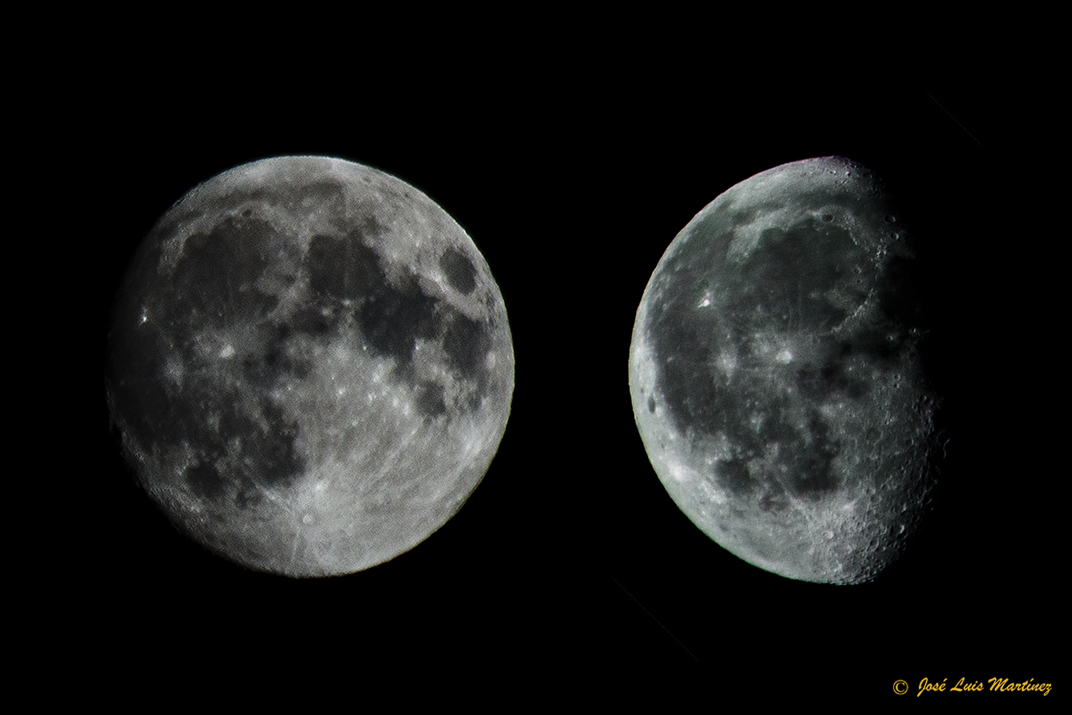Dos fotos de la Luna en dos fases diferentes, realizadas ambas desde Querol sin telescopio, con una cámara Canon EOS 70D y un objetivo Canon 70-300.