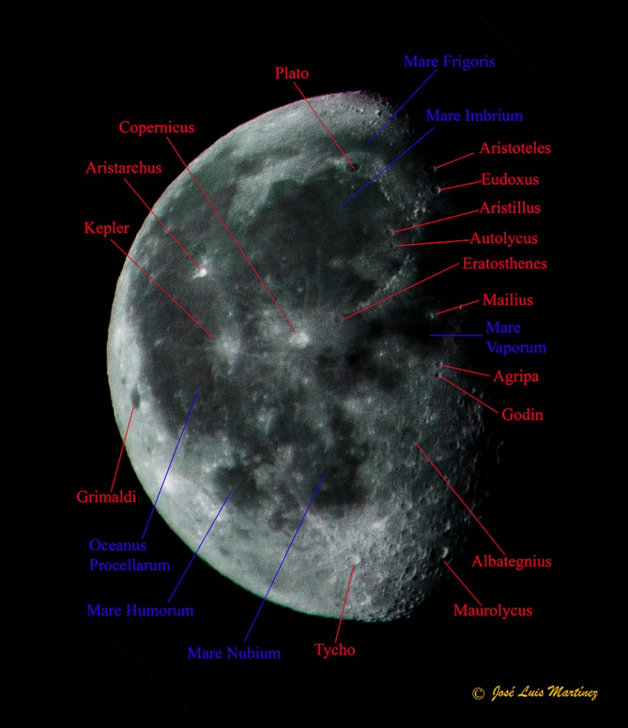 Aquí la Luna se encontraba en fase gibosa menguante en su 19º día, a tres días de cuarto menguante y con una iluminación del 81%. En esta fase su geología es mucho más apreciable, especialmente en la zona del terminador (frontera entre el día y la noche selenita), donde el contraste y las sombras son mucho más marcados. He señalado los cráteres y mares más importantes.