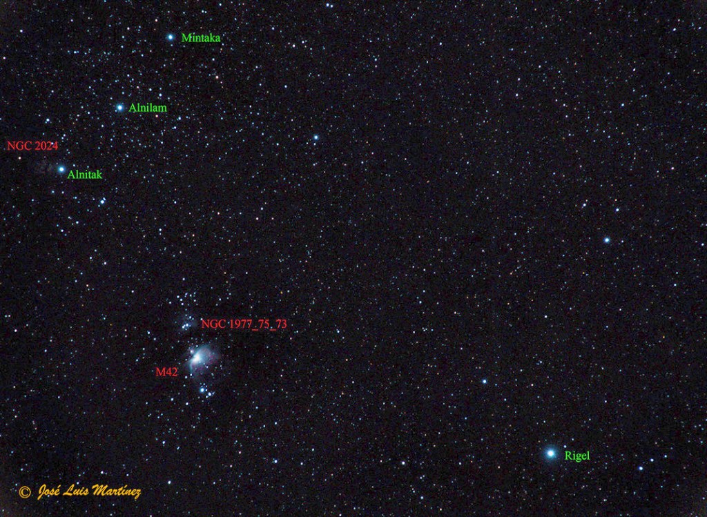 En esta otra imagen de gran campo, realizada desde Cornellà de Llobregat el día 10 de enero de 2015 con una cámara Canon EOS 70D y un objetivo Sigma 70-300, se muestra con más detalle la ubicación en la espada de Orión de esta nebulosa. En ella vemos también, además de la brillante M42, la nebulosa de la Flama, en el extremo izquierdo del cinturón formado por las tres Marias (Alnitak, Alnilam y Mintaka).