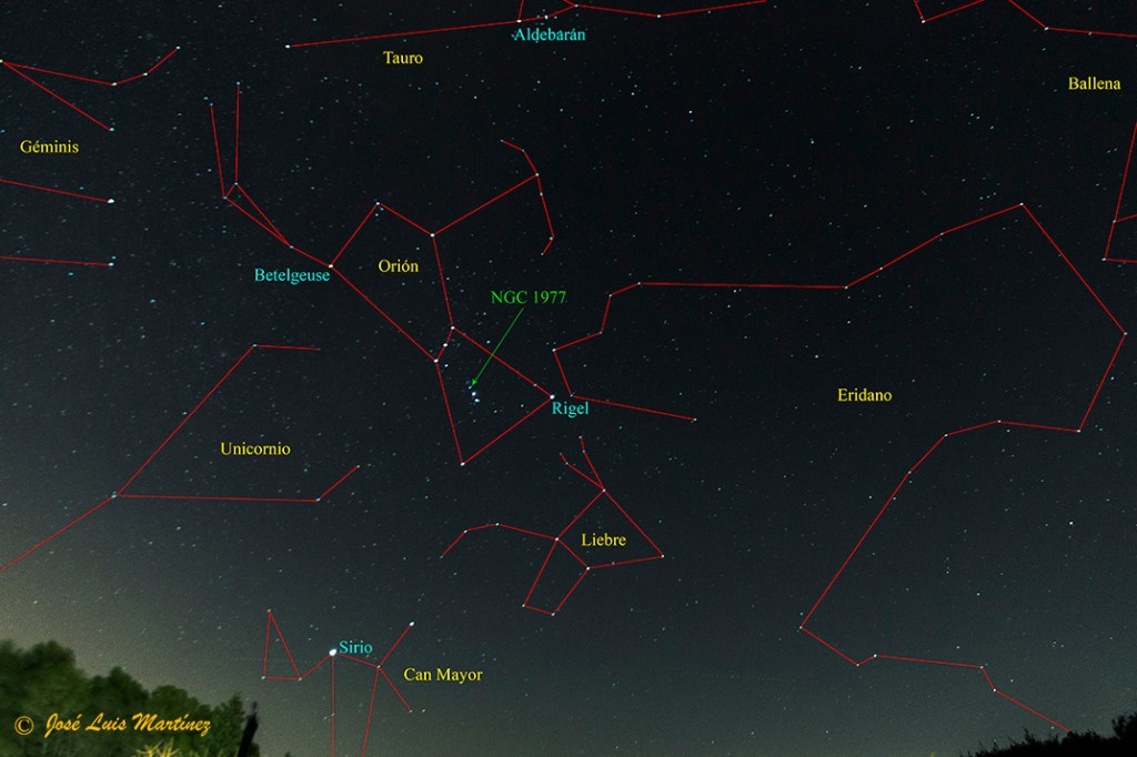 La siguiente fotografía, realizada desde Querol el día 7 de diciembre de 2018 con una cámara Canon EOS 70D y un objetivo Canon 15-85, muestra la ubicación en el cielo de esta nebulosa de reflexión (coordenadas ⇒ AR: 5h 35m 16s / Dec: -4º 49′ 15″).