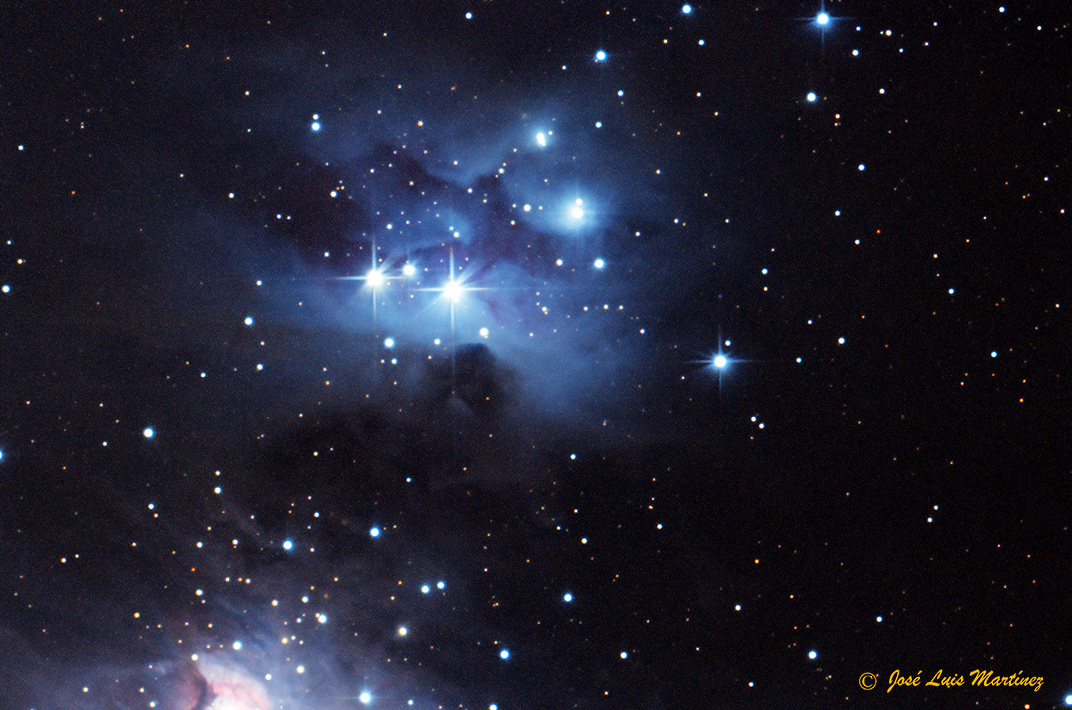 La siguiente imagen, que es un recorte de una fotografía de la espada de Orión, realizada desde Querol el día 16 de enero de 2016 con un telescopio refractor Long Perng ED80 y una cámara Canon EOS 70D, muestra la nebulosa del hombre corriendo y la espectacular Gran nebulosa de Orión (M42 y M43).