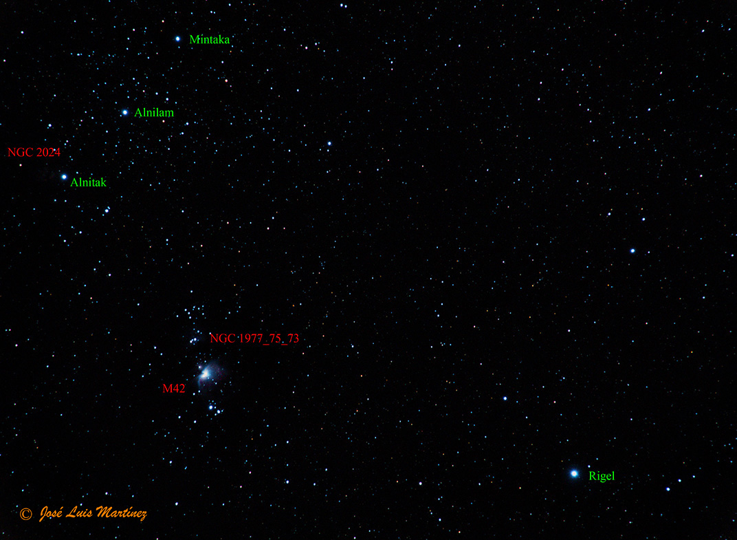 En esta otra imagen de gran campo, realizada desde Cornellà de Llobregat el día 10 de enero de 2015 con una cámara Canon EOS 70D y un objetivo Sigma 70-300, se muestra con más detalle la ubicación en la espada de Orión de esta nebulosa. En ella vemos también, además de la brillante M42, la nebulosa de la Flama, en el extremo izquierdo del cinturón formado por las tres Marias (Alnitak, Alnilam y Mintaka).