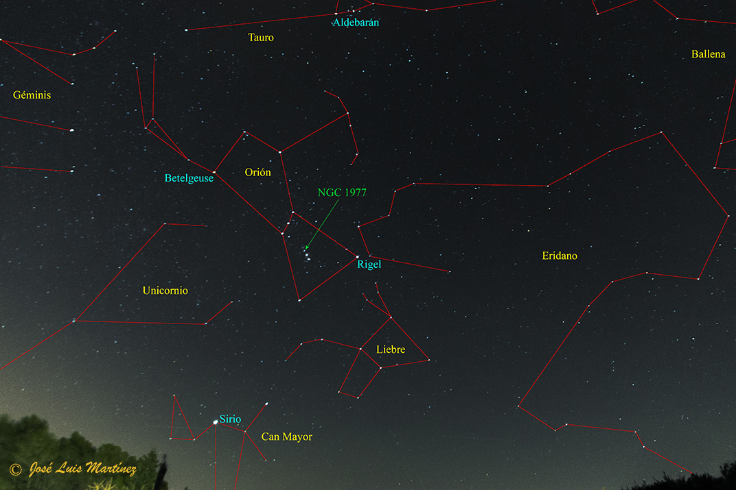 En la siguiente imagen, realizada desde Querol el día 8 de diciembre de 2018 con un telescopio reflector Skywatcher 200/1000 y una cámara Canon EOS 550D, se pueden apreciar mejor las distintas partes de esta nebulosa: NGC 1977 es la nebulosa más grande y es la que está en la parte inferior, dijéramos que por debajo de los pies del hombre corriendo; separada por esta zona oscura nos encontramos con NGC 1975 a la izquierda y NGC 1973 a la derecha, envolviendo a una estrella. Además, por la parte inferior de la fotografía empieza a asomar la Gran Nebulosa de Orión, en concreto M43, La nebulosa De Mairan.