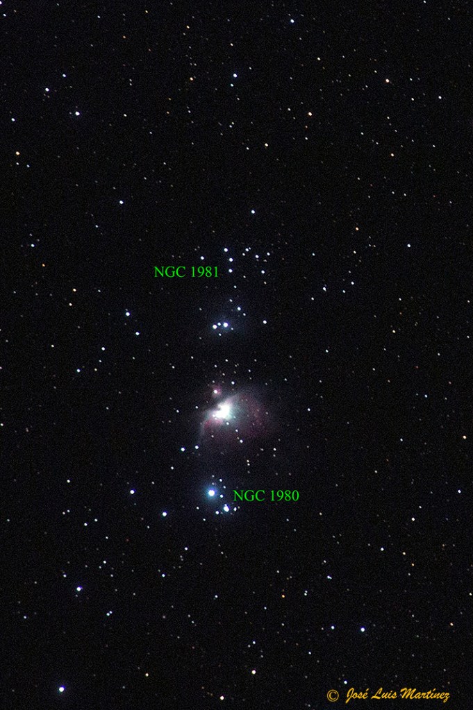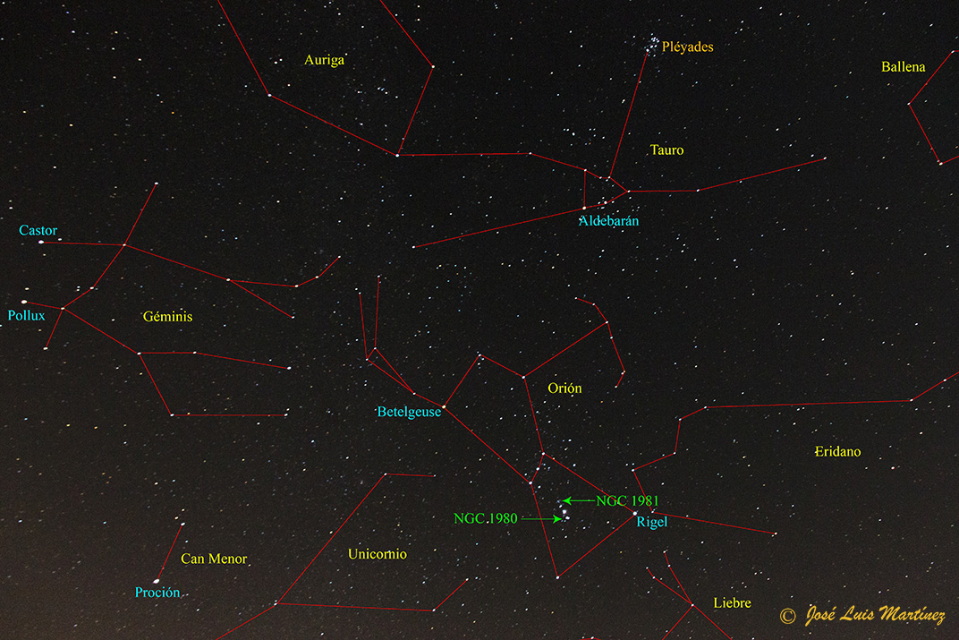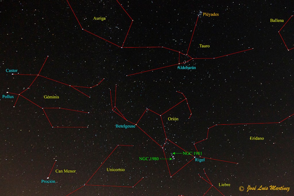 La siguiente fotografía, realizada desde Querol el día 12 de enero de 2019 con una cámara Canon EOS 70D y un objetivo Canon 15-85 muestra la ubicación en el cielo de estos dos cúmulos abiertos (coordenadas: NGC 1980, AR: 5h 35m 24s / Dec: -5º 54′ 54″; NGC 1981, AR: 5h 35m 09s / Dec: -4º 25′ 55″).