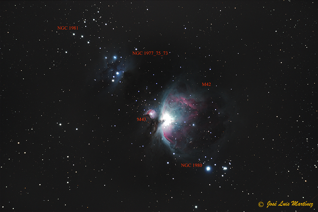 La siguiente fotografía de la espada de Orión, hecha desde Querol el día 16 de enero de 2016 con un telescopio refractor Long Perng ED80 y una cámara Canon EOS 70D, muestra estos objetos de cielo profundo mencionados.