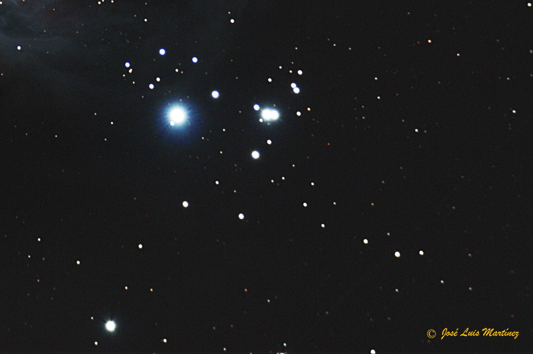La siguiente fotografía, realizada desde Sant Joan de les Abadesses, en el Ripollès (Gerona), el día 14 de febrero de 2015 con una cámara Canon EOS 70D y un objetivo Canon 15-85, es un detalle de gran campo de la espada de Orión, donde podemos ver estos dos cúmulos, así como la Gran nebulosa y la nebulosa del Hombre corriendo.