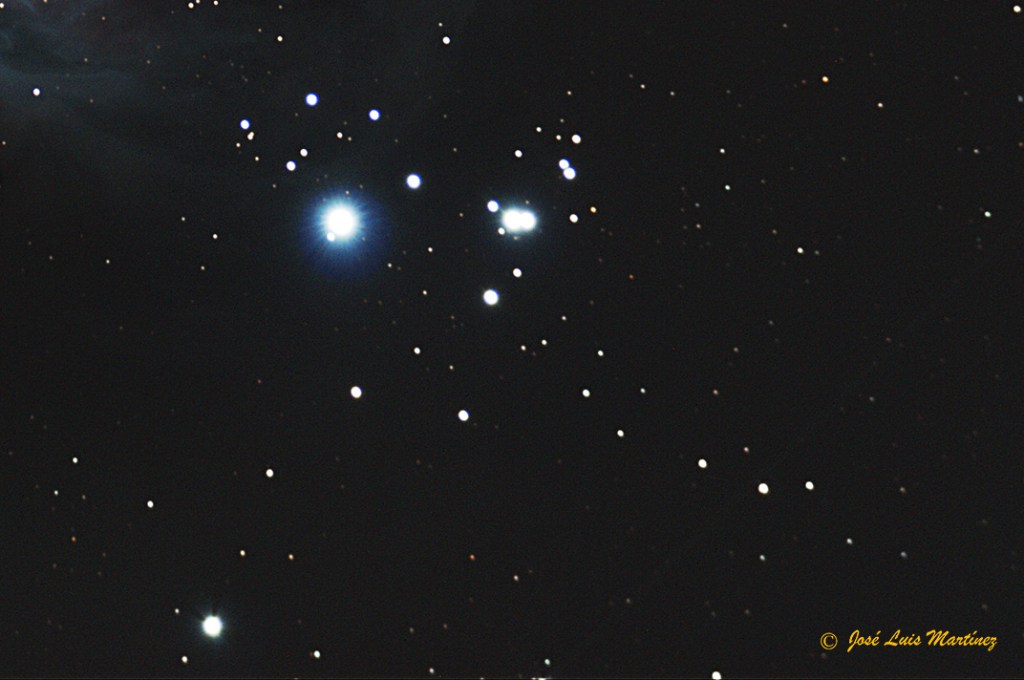 Está formado por unas veinte estrellas de diferentes magnitudes, pero la que más destaca es Hatsya (ι Ori, Iota Ori) de magnitud aparente 2,75, la estrella más brillante del cúmulo. Hatsya es una gigante azul que no está sola, ya que es una estrella triple. Una de sus compañeras está muy cerca y contrasta mucho con Hatsya, ya que es de magnitud 7 y se ve muy pequeña y muy cerca de Hatsya (en la imagen anterior puede verse justo debajo y un poco a la izquierda de Iota Ori). Pero si nos fijamos, no es la única estrella múltiple del cúmulo, ya que, a la derecha de Hatsya (en la imagen anterior), podemos ver dos estrellas dobles.