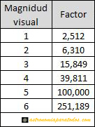 y en la cual de una magnitud a la siguiente hemos de multiplicar por 2,512 o raíz quinta de 100. Así, una estrella de 1ª magnitud es 2,512 veces más brillante que una de 2ª magnitud, 6,310 veces más brillante que una de 3ª magnitud, …, 100 veces más brillante que una de 6ª magnitud.
