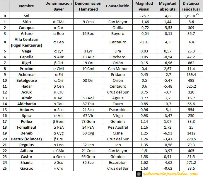 La tabla siguiente muestra los nombres y la magnitud de las 25 estrellas más brillantes.