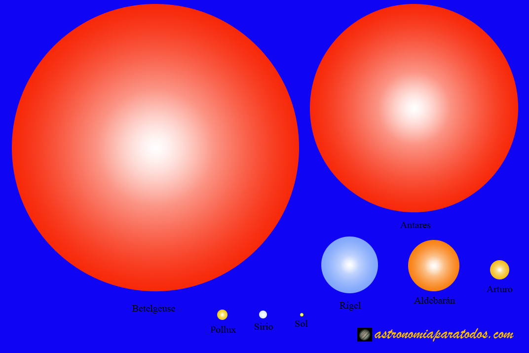 Hay estrellas muy grandes, las llamadas supergigantes, como Betelgeuse o Antares; estrellas grandes, las llamadas gigantes, como Rigel o Aldebarán; estrellas medianas, como el Sol o Sirio y estrellas muy pequeñas (algo más grandes que una enana marrón), son las llamadas enanas, como Sirio B (Sirio es una estrella binaria formada por Sirio o Sirio A, una estrella mediana y Sirio B, una enana blanca) o Proxima Centauri, la estrella más cercana a nosotros, después del Sol, que es una enana roja y que también forma parte de un sistema múltiple.