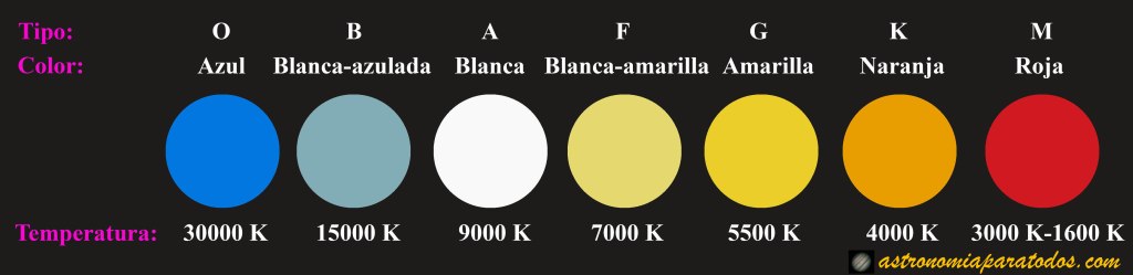 Pero no solo existen diferencias en el tamaño, sino que las estrellas también son diferentes en temperatura/color, (estas dos características, temperatura y color, están relacionadas): las estrellas más calientes (unos 30000 K) son azules y las más frías (entre 3000 K a 1600 K) son rojas. Este aspecto hace que hayan siete tipos de estrellas según su temperatura/color, según su llamado tipo espectral, como puede verse en la figura siguiente.