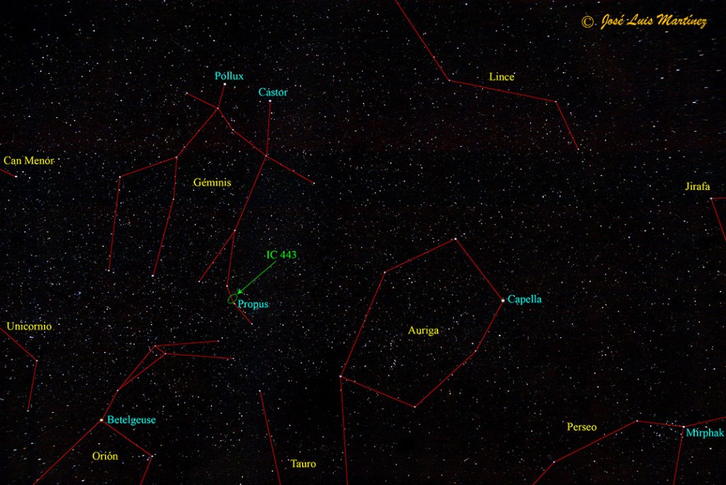 Situado en el cielo en la constelación de Géminis, casi «tocando» a la estrella Propus (η Gem), y a una distancia de unos 5000 años luz, se encuentra el objeto catalogado como IC 443, aunque también está incluido en el catálogo Sharpless como Sh2-248 y en el de Lynds como LBN 844, y conocido como la nebulosa Medusa, ya que recuerda a este primitivo y simple, pero peligroso, animal marino.
