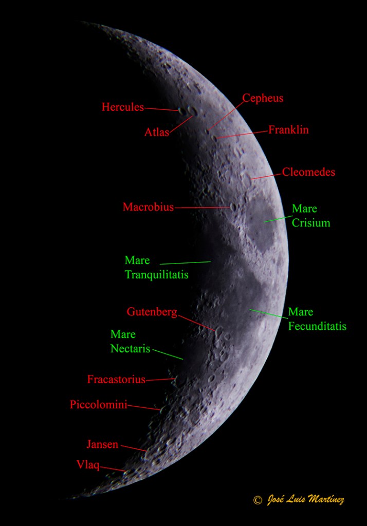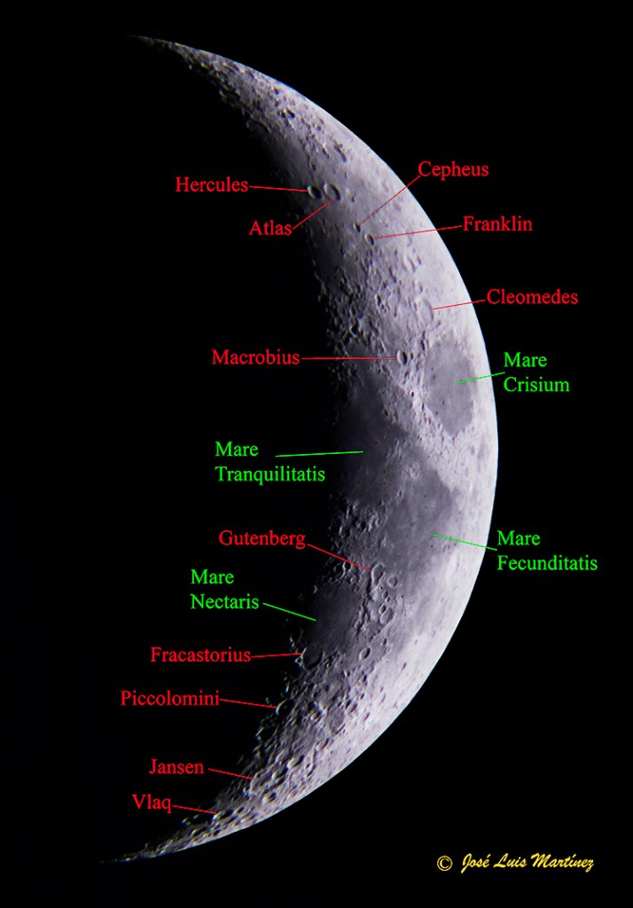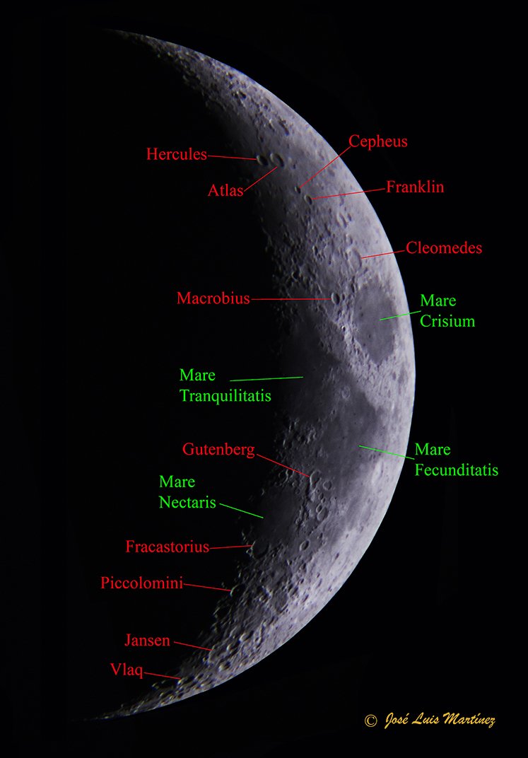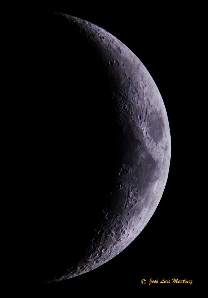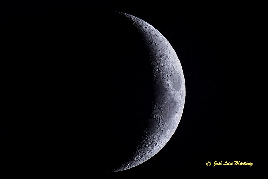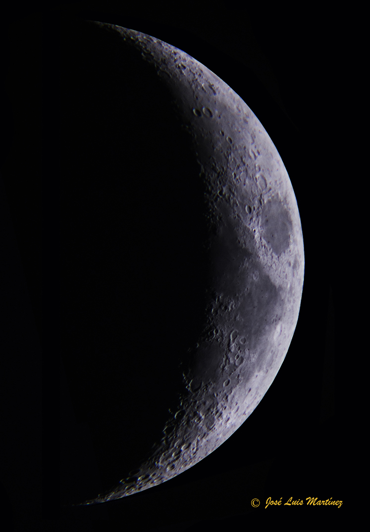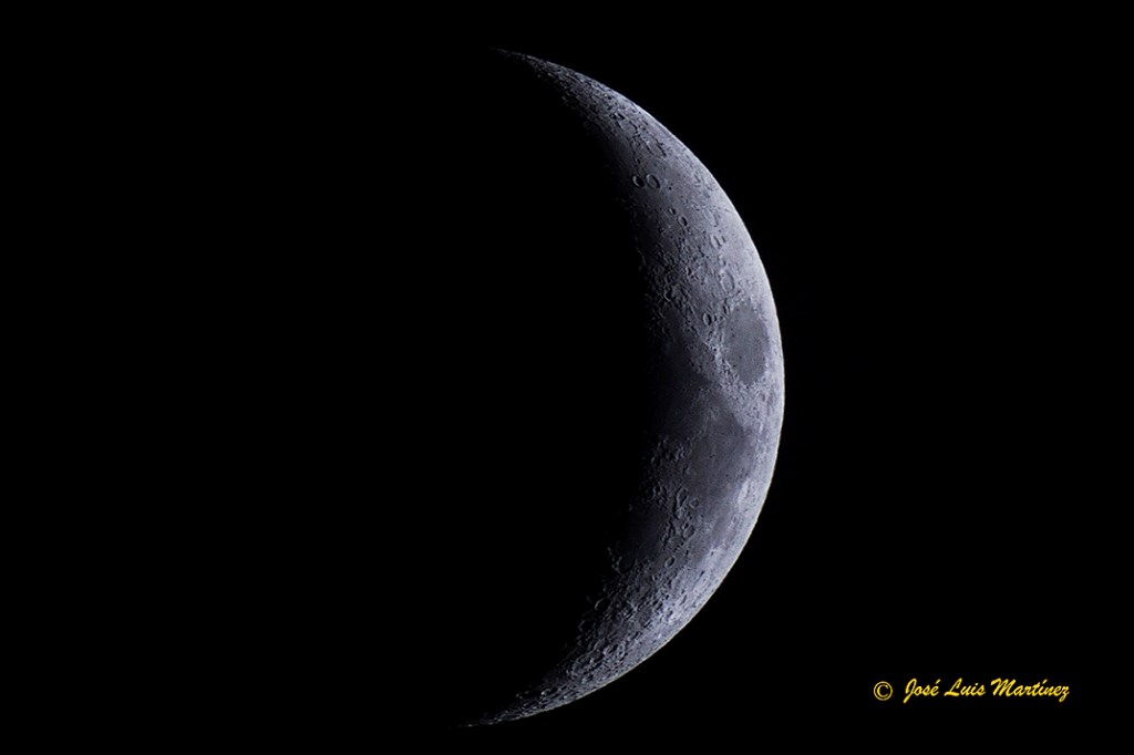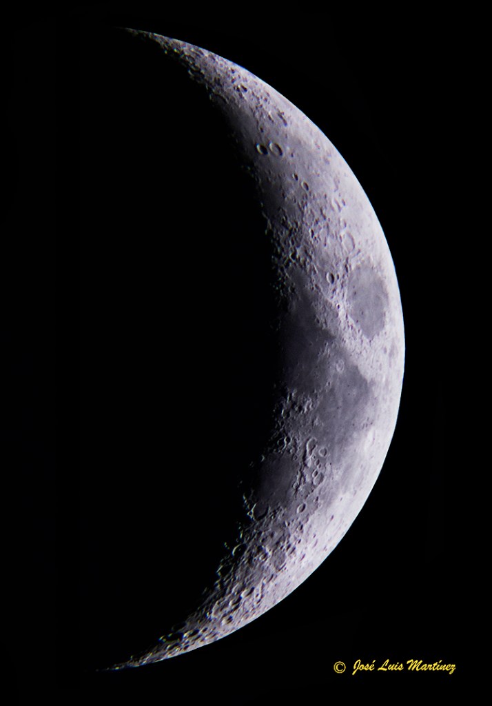 De esta manera, con un telescopio refractor Long Perng ED80 y una cámara Canon EOS 70D, le hice esta fotografía a la Luna creciente de cinco días.