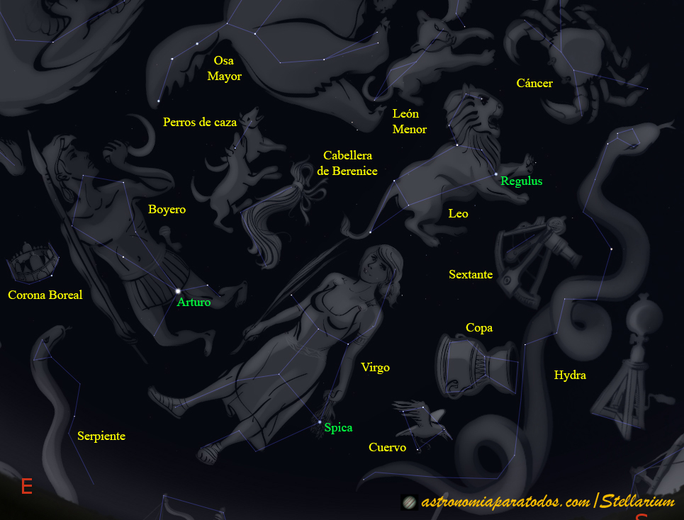 En las siguientes imágenes podemos ver todas estas constelaciones de primavera, así como las figuras que representan estas constelaciones, realizada esta última a partir del Stellarium.