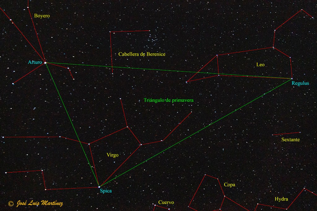 Como he comentado, no es un cielo que destaque por estrellas brillantes; en concreto, son tres las estrellas más brillantes de este cielo, las cuales son las estrellas más brillantes de las tres constelaciones que presiden el cielo de primavera: Arturo del Boyero (Bootes), Spica de Virgo y Regulus de Leo. Además, estas tres estrellas forman el Triángulo de primavera, un enorme asterismo en forma de triángulo en cuyos vértices se encuentran las tres estrellas mencionadas.